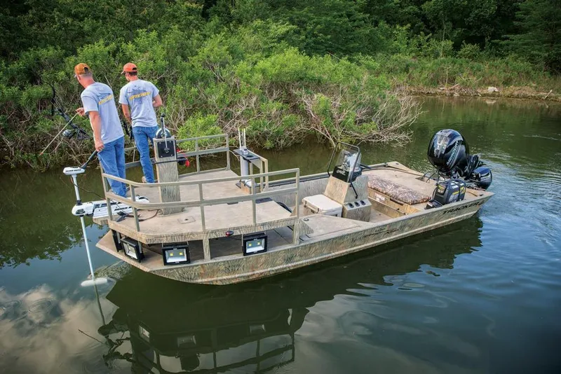 • Kicker-outboard control tower on elevated bow shooting deck w/throttle & stick-steer (folds down for storage/towing)