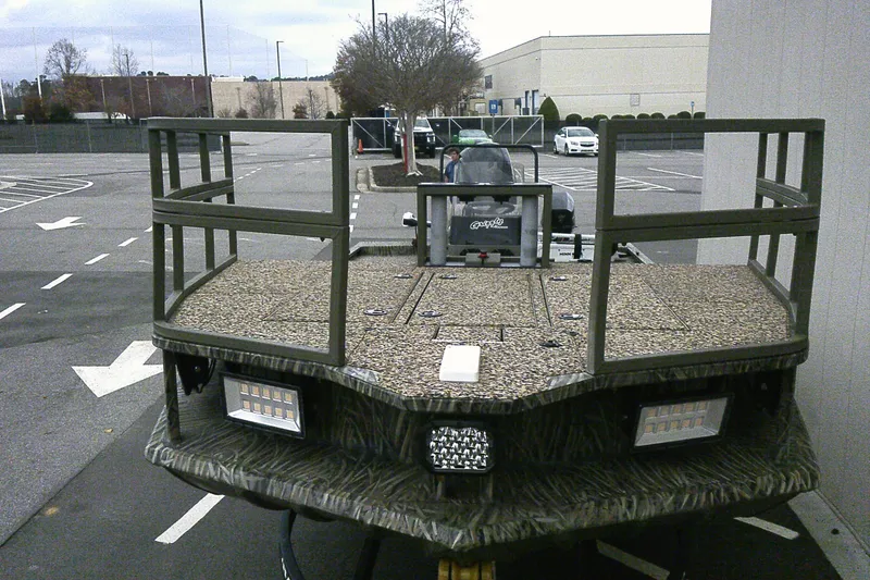 Fixed & elevated bow shooting deck w/railing, rail-mounted utility tray w/arrow, tool & drink holders, 2 pedestal seat base locations, 160W Outrigger Outdoors® bowfishing lights & under-deck storage compartments