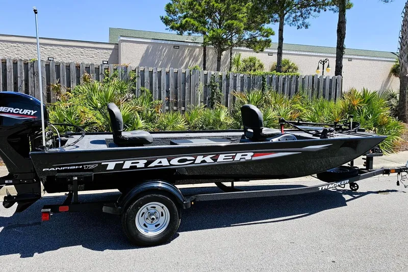 The TRACKER Panfish 17 remains a proven stick steer boat, expertly designed for crappie, bream, and bluegill enthusiasts. Its thoughtful features and efficient layout continue to make it a favorite among anglers of all levels. Built from premium marine-grade aluminum, the hull is precisely robotically cut for accuracy and assembled by skilled craftsmen using advanced equipment, resulting in a durable, all-welded construction that stands the test of time. Inside, the Panfish 17 offers a practical and budget-friendly interior. The bow driver's station includes a throttle and steering stick, complemented by a standard fishfinder and electronics to help you locate and stay on the fish. A large bow storage compartment keeps your gear organized, accessible, and protected from the elements. The cockpit's well-designed layout provides ample space for you and a friend or two to carry all your essentials for a successful day on the water. A center livewell, topped with a cushioned seat for two, offers convenient fish storage, while the rear fold-down fishing seat conceals additional storage options. Powering this reliable vessel is a smooth Mercury® engine, engineered for efficient and economical performance. Whether you're seeking a versatile fishing platform or a boat that allows you to catch fish comfortably from your seat, the Panfish 17 continues to be a dependable choice for anglers looking to maximize their time on the water.