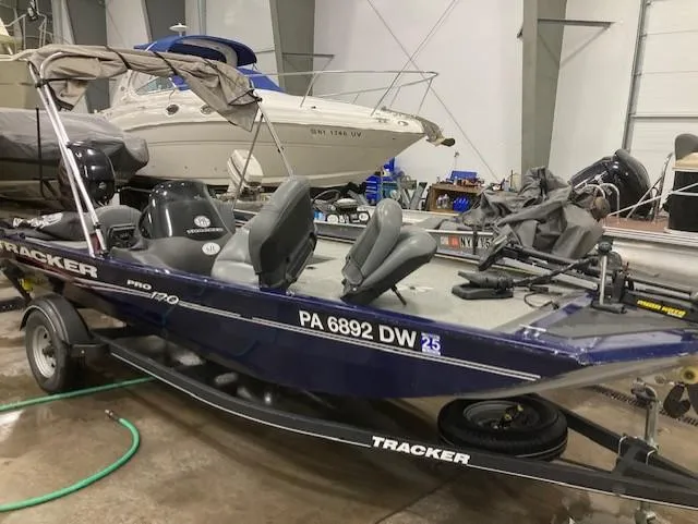 Recent trade in, they purchased a new boat from us. 2019 Tracker Pro 170 with a Mercury 40 hp, four stroke motor with only 92 hours on it. Lowrance 4X fish finder, dual batteries with a charger, two pedestal - removable fishing seats, bimini top, full mooring/trailering cover. Includes the single axel trailer with spare tire and swing away tongue. The boat is from Northern PA.This is turn key, fully equipped, fresh water fishing boat - ready to GO!