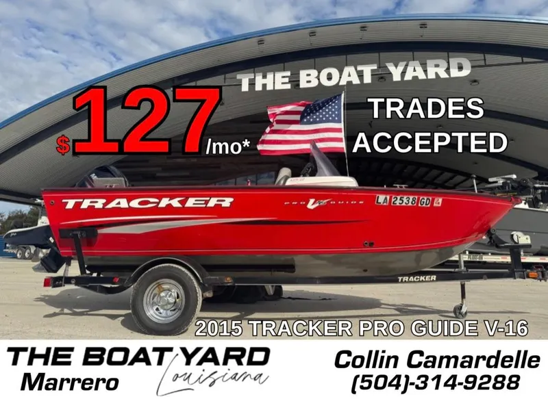 2015 Tracker Pro Guide V-16Mercury 60 4 Stroke (433 HRs)Single Axle Trailer***FINANCING AVAILABLE***Trade Ins Accepted10$ DOWN $127/MONTH (WITH APPROVED CREDIT)*Contact Collin for more info 504-314-9288SPECIFICATIONSLength-16' 6''Beam-7' 4''Bottom Width-5' 10''Fuel Capacity-25.5 gal.Max. Person Capacity-5 personsMax. Person Weight-655 lbs.Max. Person, Motor & Gear Weight-1200 lbs.Interior Depth-25.5''Transom Height-21''Deadrise At Bow-35 degreesDeadrise At Transom-20 degreesDraft-15''Hull Material-0.100 5052 marine alloyAverage Dry Weight-1170 lbs.Average Package Weight-2535 lbs.Package Height-6' 8''Package Width-7' 6''Towing Length-22' 1''Storage Length (W/Outboard Trimmed Down)-19' 10''