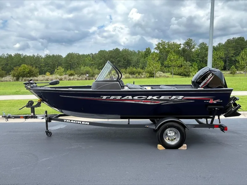 The TRACKER PRO GUIDE V-16 WT packs a punch in a compact, Deep V hull design. The walk-thru windshield shields you from the elements, ensuring comfort in all conditions. With three fishing seats and six customizable setups, the PRO GUIDE V-16 WT is ready for your whole crew. The Deep V hull is sdesigned for smooth, dry performance and peak edge-to-edge stability. It has space galore, so you can haul all your gear with ease. Up front is a standard Minn Kota trolling motor with a livewell/baitwell and twin storage boxes while the console features a Garmin Striker 4 color fishfinder with a full gauge setup and smooth, reliable steering. Rounding out the package are a custom-fitted trailer and reliable, economical four stroke Mercury power.