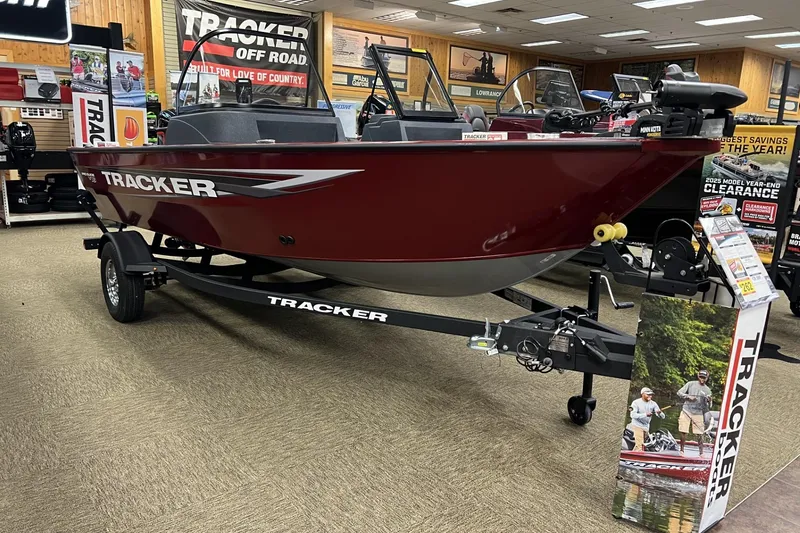 The TRACKER PRO GUIDE V-16 WT packs a punch in a compact, Deep V hull design. The walk-thru windshield shields you from the elements, ensuring comfort in all conditions. With three fishing seats and six customizable setups, the PRO GUIDE V-16 WT is ready for your whole crew. The Deep V hull is sdesigned for smooth, dry performance and peak edge-to-edge stability. It has space galore, so you can haul all your gear with ease. Up front is a standard Minn Kota trolling motor with a livewell/baitwell and twin storage boxes while the console features a Garmin Striker 4 color fishfinder with a full gauge setup and smooth, reliable steering. Rounding out the package are a custom-fitted trailer and reliable, economical four stroke Mercury power.