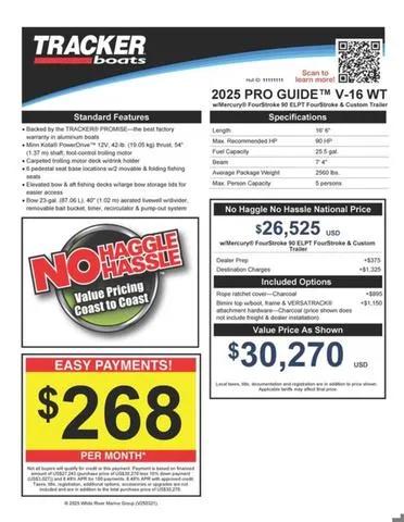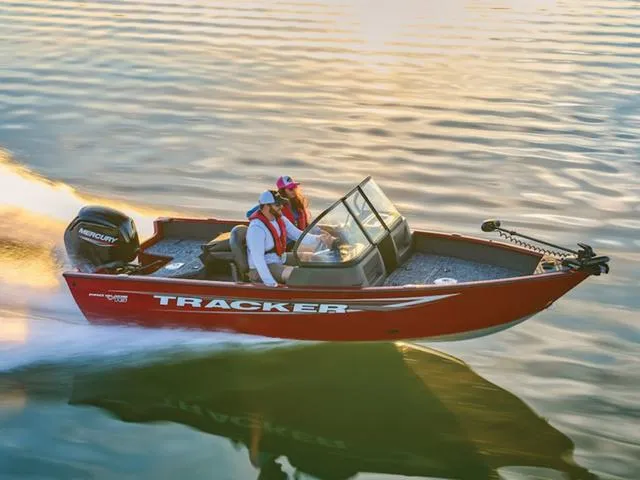 The TRACKER PRO GUIDE V-16 WT packs a punch in a compact, Deep V hull design. The walk-thru windshield shields you from the elements, ensuring comfort in all conditions. With three fishing seats and six customizable setups, the PRO GUIDE V-16 WT is ready for your whole crew. The Deep V hull is sdesigned for smooth, dry performance and peak edge-to-edge stability. It has space galore, so you can haul all your gear with ease. Up front is a standard Minn Kota trolling motor with a livewell/baitwell and twin storage boxes while the console features a Garmin Striker 4 color fishfinder with a full gauge setup and smooth, reliable steering. Rounding out the package are a custom-fitted trailer and reliable, economical four stroke Mercury power.