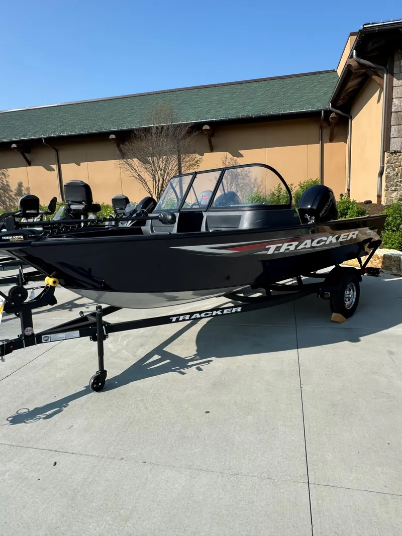 The TRACKER PRO GUIDE V-16 WT packs a punch in a compact, Deep V hull design. The walk-thru windshield shields you from the elements, ensuring comfort in all conditions. With three fishing seats and six customizable setups, the PRO GUIDE V-16 WT is ready for your whole crew. The Deep V hull is sdesigned for smooth, dry performance and peak edge-to-edge stability. It has space galore, so you can haul all your gear with ease. Up front is a standard Minn Kota trolling motor with a livewell/baitwell and twin storage boxes while the console features a Garmin Striker 4 color fishfinder with a full gauge setup and smooth, reliable steering. Rounding out the package are a custom-fitted trailer and reliable, economical four stroke Mercury power.