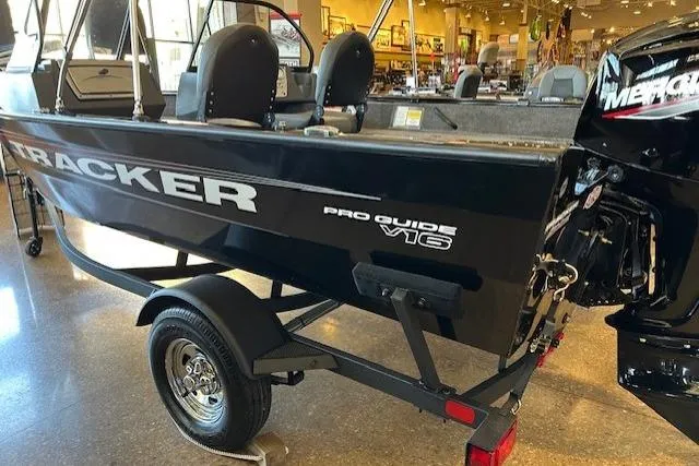 The TRACKER PRO GUIDE V-16 WT packs a punch in a compact, Deep V hull design. The walk-thru windshield shields you from the elements, ensuring comfort in all conditions. With three fishing seats and six customizable setups, the PRO GUIDE V-16 WT is ready for your whole crew. The Deep V hull is designed for smooth, dry performance and peak edge-to-edge stability. It has space galore, so you can haul all your gear with ease. Up front is a standard Minn Kota trolling motor with a livewell/baitwell and twin storage boxes while the console features a Garmin Striker 4 color fishfinder with a full gauge setup and smooth, reliable steering. Rounding out the package are a custom-fitted trailer and reliable, economical four stroke Mercury power.