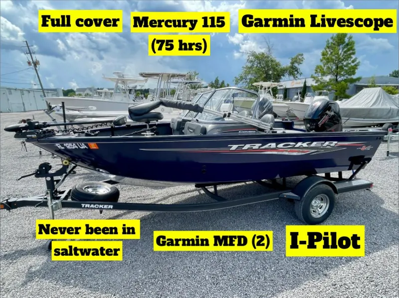 LIKE NEW! Always stored under cover. There is no comparable boat on the market like this in terms of price, condition, and accessories. Priced well below book value for quick sale! Only 75 (100% freshwater) hours on a Mercury 115 Pro XS. Trailer, full cover, bimini top, two Garmin MFD's (bow and helm), trolling motor with foot pedal and I-Pilot, and Garmin Livescope are are included.