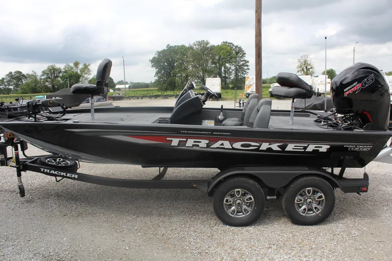 The 2026 Tracker® Pro Team™ 195 Tournament Edition is an all-welded aluminum bass boat built for tournament-level fishing, featuring a tournament-proven layout with dual Lowrance fishfinders, a Minn Kota trolling motor, a center tackle storage system, dual 8-foot bow rod boxes, and a spacious front deck. It's powered by a 150 HP Mercury FourStroke engine for top speeds over 60 mph, incorporates a Tracker touchscreen gauge display, and includes a new Diamond Coat finish for added durability and shine. The boat is constructed with a Revolution hull for a smooth ride and a Power-Track Setback transom, along with convenient features like a built-in battery charger, a large insulated livewell, and weather-resistant storage.