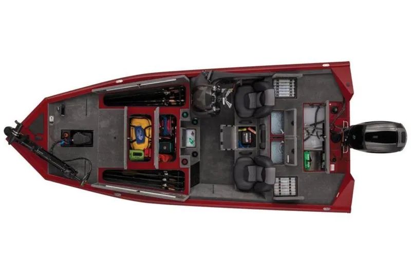 - Tournament-style 39-sq.-ft. (3.62-sq.-m) elevated bow deck w/oversized dual rod boxes & center tackle organizer