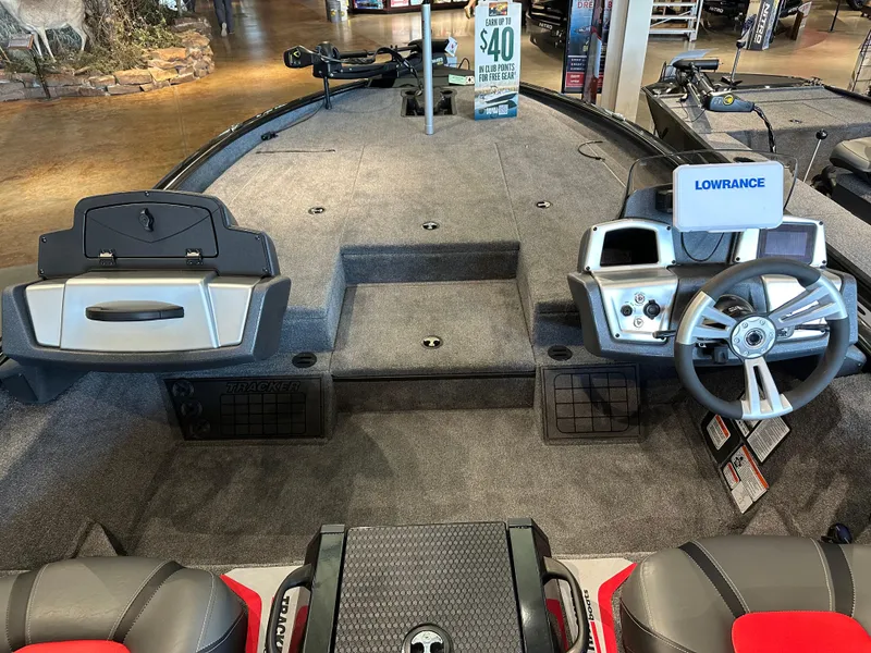 - 1-piece rotomolded TRACKER® console w/built-in controls, storage pocket & windscreen