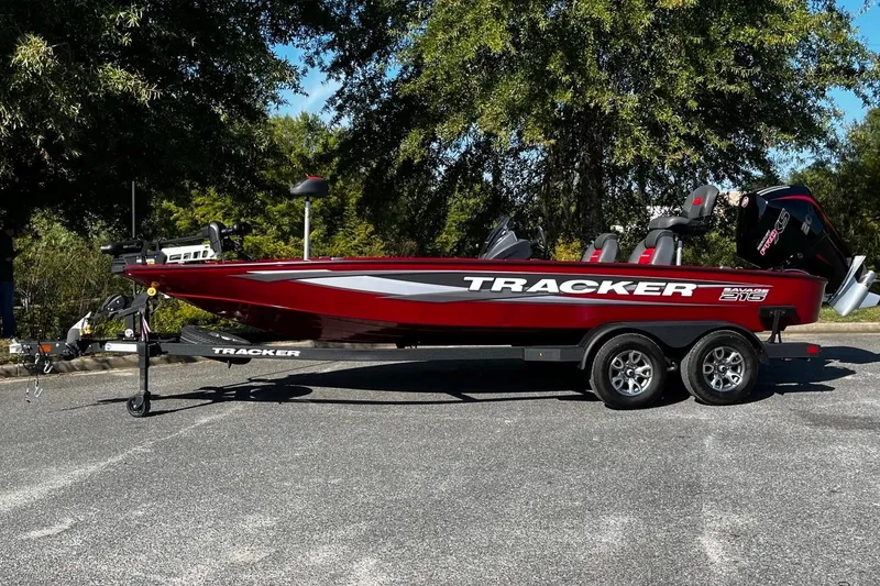 The Savage 215 carries up to 250 horses and boasts a finely-tuned hull that takes advantage of every last one of 'em. The patent-pending POWER CURVE™ hull delivers an instant hole shot, and as RPMs ramp up, the tough-as-nails .125"-thick aluminum hull gives precise feedback to the wheel. At the 70-plus MPH top end, this new TRACKER® leads the pack. On the trolling motor, you'll find a gargantuan front deck covered in optional DURATRACK marine flooring, replete with expansive storage boxes and a pro-designed layout that keeps gear handy, safe, and organized. The cockpit is decked-out with big-screen electronics, a TRACKER digital touchscreen display (instead of old-school gauges) and handmade seating designed to tackle the elements in comfort.