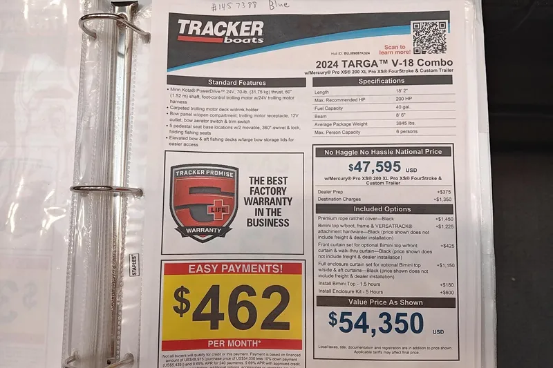 Use our boat payment calculator to estimate monthly payments for 2024 Tracker Targa V-18 Combo. Enter your down payment, choose a loan term, and adjust the interest rate to see an instant payment estimate — ideal if you're calculating boat payments before you enquire. Wondering how much does a Aluminum Fishing cost in today's market, or how much does a Tracker cost for similar models? This boat financing calculator helps you compare scenarios in seconds, whether you're considering used boat financing or a new purchase.