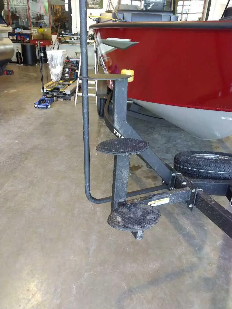 Integrated boarding steps & safety handle for boarding at bow while boat is on trailer