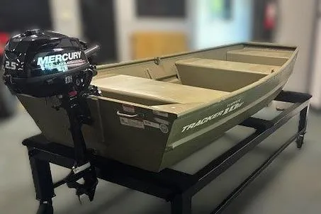 Used 2017 Tracker Topper 1036 Riveted Jon, with a 2.5 hp MERCURY outboard engine.