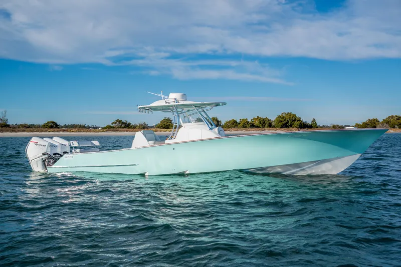 This Tribute 37 is a high-performance, custom-built center console fishing boat known for its patented stepped hull design, offering a dry, fast, and stable ride for an achievable top speed in excess of 78 mph. Featuring premium Garmin electronics, extensive fishing amenities (livewells, fish boxes, rod holders), and a focus on superior fit and finish with advanced materials. Key specs include a 37'6" LOA, 10'2" beam, 365-gallon fuel capacity, and a robust construction using epoxy-infused glass/Kevlar/carbon.