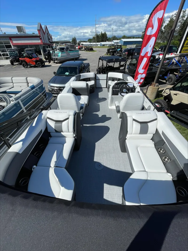 Turn heads on the water with this stunning 2024 Trifecta 22RFCS, finished in a clean white exterior paired with the eye-catching Blackout Trim Package. Powered by a reliable and fuel-efficient 115HP Mercury 4-stroke, this pontoon blends comfort, performance, and sleek style.