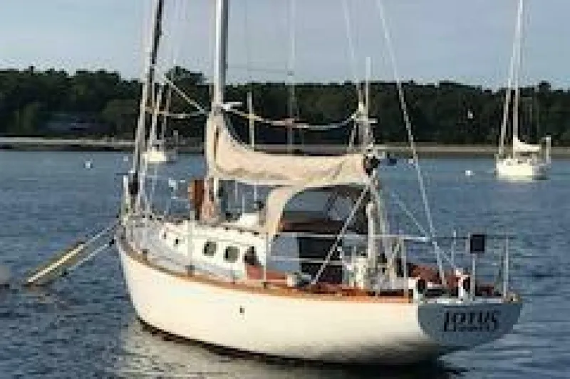 New Westerbeke 3-cylinder 27 hp diesel and custom properly installed muffler were installed. New Doyle loose-footed main with three reefing points was purchased, as well as 100% jib and asymmetrical spinnaker in 2004. New standing rigging and life lines in 2012. New Regatta Braid mainsheet and blocks in 2013. New digital radar by Raymarine in 2014. Harken roller-furling/reefing 120% jib by Maine Sailing Partners. New Dickerson 2-burner galley stove in 2020 and new dodger by Shoals Canvas in 2015.