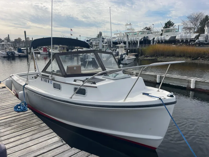 Solid Glass construction, small V-Berth, Teak windshield with Navy Blue Sunbrella Bimini Top and a large cockpit....a fishermans dream!