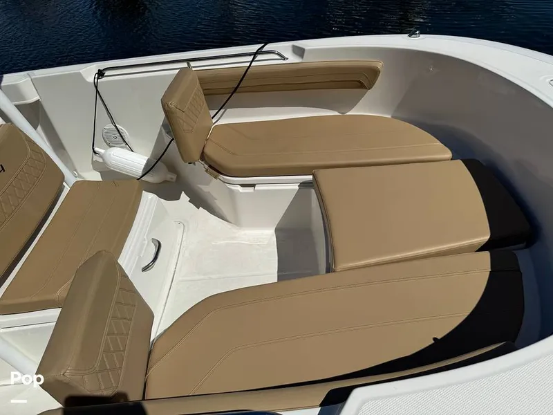 It features comfortable tan upholstery and a practical layout that's equally suited for offshore fishing trips or laid-back cruising on the water.