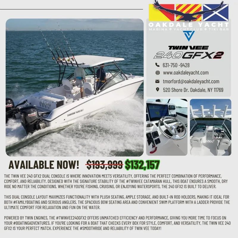 This Twin Vee 240 GFX DC is available now and ready to elevate your boating experience, whether you're planning a weekend fishing trip or a family outing on the water. With advanced features and a reputation for performance, this model is a fantastic addition to any boater's lineup.