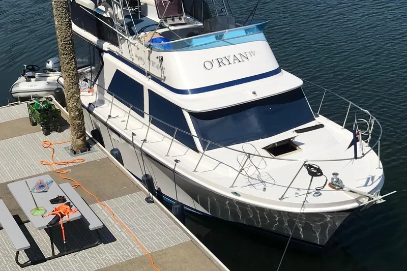 O'Ryan is a well-kept, "must see" USA built, 32' Uniflite Sport Sedan which was special ordered from the factory with numerous upgrades to better prepare for longer cruises to include 3 helm stations, integrated bait tank under the swim step, additional water tank, etc.