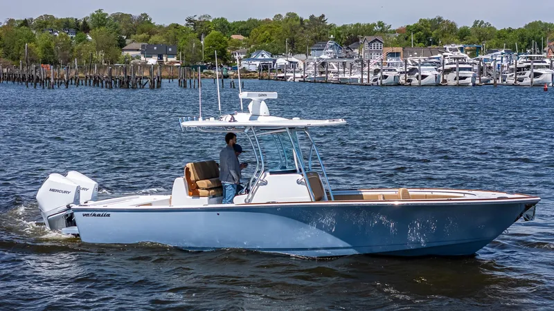 The 2025 Valhalla V-29 combines big boat features with bay boat versatility, offering the patented Stepped-V Ventilated Tunnel from Michael Peters Yacht Design for superior speed, stability, and efficiency. Its fish-focused layout includes dual 26-gallon live well, insulated fish boxes, and extensive rod storage, making it ideal for tournaments or as a luxury yacht tender. With a 180-gallon fuel tank the V-29 delivers exceptional range and fuel efficiency. Features like the Seakeeper 1, bow thruster, Release helm chairs, and premium upholstery with Bentley stitching elevate comfort and performance. The contemporary helm offers Garmin electronics, teak finishes, and Bocatech switches, while the optional hardtop enhances versatility. Maximized bilge access and superior serviceability reflect Valhalla's commitment to quality and craftsmanship, ensuring the V-29 leads in performance, luxury, and innovation.