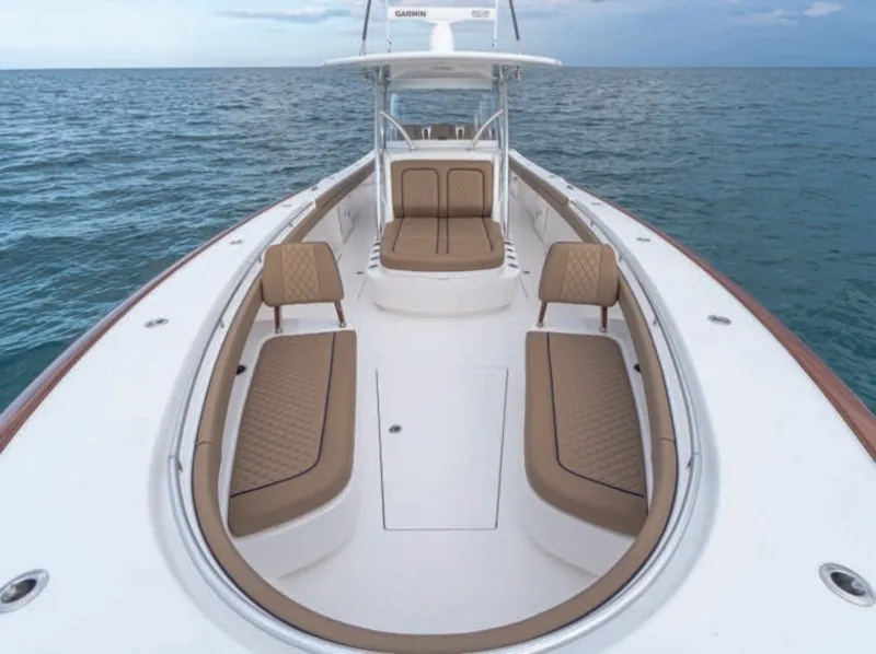 On deck, a raised transom livewell, in deck fish boxes, rod holders, port dive door and an abundance of storage space are just a few of the standard features on the V-41. Also featured is a forward console lounge and optional port and starboard forward seating with forward facing backrests. The consoles of the V-series boats will feature rod storage, a head, sink, and access to electronics, electrical distribution panel and other critical components.