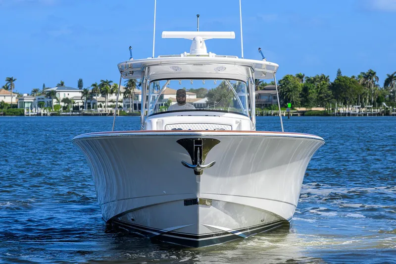 The V-46 possesses the same signature design traits (S-shaped sheer, doubles chines, tumblehome transom bustle), aesthetic enhancements (teak toerails and transom) and 360-degree fishing prowess of the V Series. This Valhalla's significant length (46' 7") and beam (13' 4") allow for a massive console that functions as an air-conditioned cabin. Through the port-side console door, a powder-coated pedestal with teak stair treads leads to an inviting living space. You'll immediately notice the headroom (6' 7") and free-flowing open layout that's filled with natural light flowing through four shapely portlights. Forward, a dinette with U-shaped seating and bolstered backrest surrounds a drop-down table that converts to a queen berth. On the starboard side is the galley, which features a polished Corian countertop, stainless steel sink, brushed nickel and chrome faucet, two-burner recessed stove, refrigerator/freezer, microwave oven and cabinet storage. Directly aft of the galley is the private head with a molded-in vanity with freshwater sink and faucet, toilet and shower.
