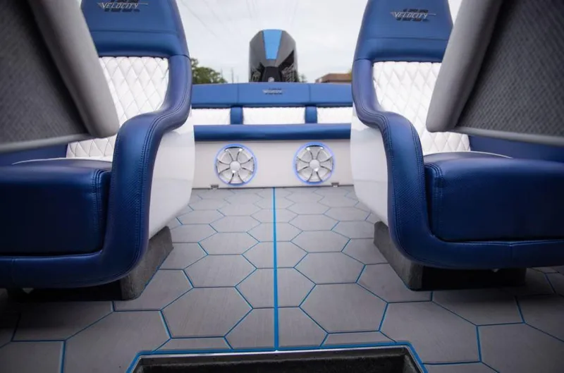 The Velocity 230SC is a large boat for it's size.The cockpit will seat 5 passengers comfortably and its upholstery is custom made in house with the best marine vinyls. An amazing Wet Sounds stereo system will keep you thumping while cruising or relaxing at the sandbar. Flooring is made by Marine Customs Design to match the boat and take the load off your feet. The cabin hosts a large 7 foot V-berth that will sleep 2 with room to spare and has a porta potti for privacy. The 230 is constructed with an advanced infusion technique and only American made fabrics. All Velocity hulls are ISO certified to DNV Hi Perfromance standards for life long use and enjoyment.