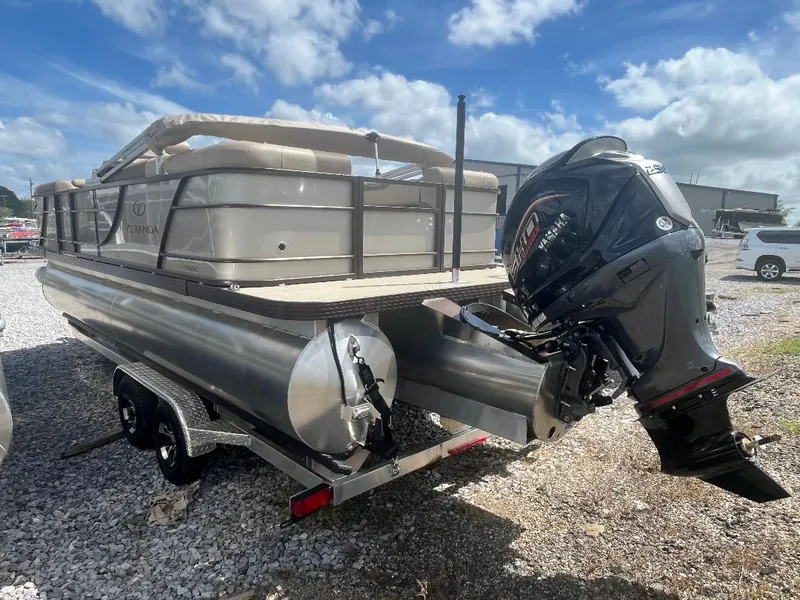 New 2025 Veranda Relax series Tri Toon with Yamaha VF250LB four stroke outboard and tandem axle aluminum Backtrack trailer in stock at Andalusia Marine!!