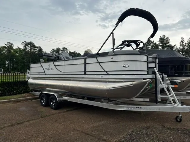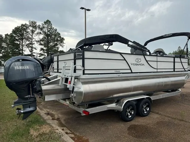 This in stock 2025 Veranda Fishing Series 22F2 Deluxe Tri-toon is offered with Yamaha F150LC engine and is loaded with options: In-floor Storage, Fish Station, Half Gate, Trim Level-Deluxe, Panel Color-Pearl White Metallic, 14 1/4x15 Pitch Powertech Prop, Rail Color-Black Rail, Flooring-Woven Teak Slate Grey, AFT Bimini Frame-Black Frame Double Bimini, Turboswing XXL, Tie Downs, Triple Toon 27" Rough Water, High Rise Hydraulic Adj Pedestal, Carbon & Dove Grey, 2 Additional Portable Armrest, Cup Holders, Rod Box, Deluxe/Luxury Harness, and AFT Bimini-Double Bimini Black