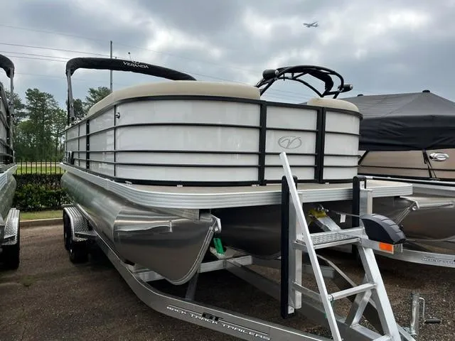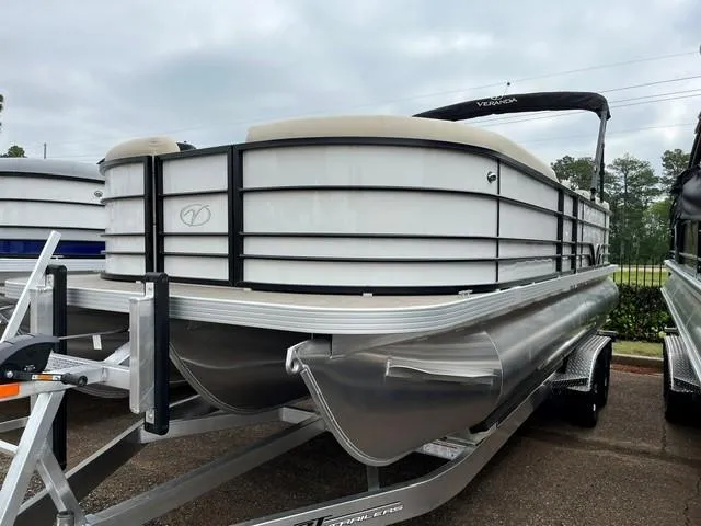 This in stock 2025 Veranda Vista View 22RC tri-toon is offered with a Yamaha F150LC engine and is loaded with options: Prop Upgrade to Powertech Stainless Hydraulic Steering White Metallic Panel Flooring: Woven Tan Hook 4X Graph Plotter Triple Toon 25" Ports Captain's Chair Wheat & Chesnut Vista View Amenities Package AFT Bimini-Vista Black Bimini Rail Color- Black Textured Power Coat Rails.. Optional Back Track Aluminum custom trailer is only $6,495
