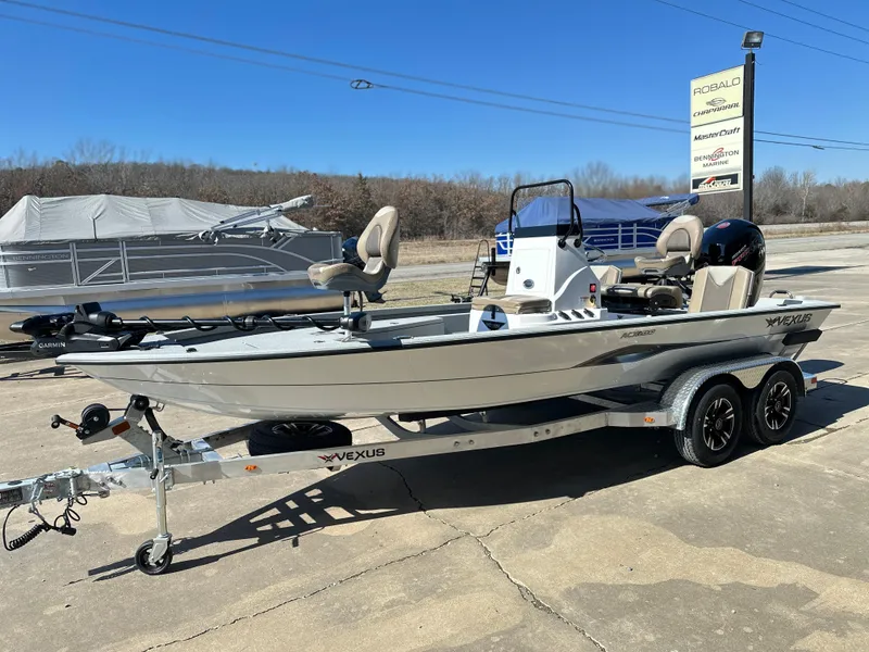 New 2025 Vexus ACX 2000 Powered with Mercury 150 Pro XS 4 Stroke - Summit White w/ Tan Seat Package / Victor Package1: Single Color Paint, Battery w/Holder/Trolling Motor(2), Stainless Steel Latch Kit, Auto Bilge Pump Replace Standard, Tilt Hydraulic Steering / Rod Shock Kit for Front Rod Boxes / Garmin EchoMap UHD 93 SV Console / Garmin Kraken Trolling Motor 63" Shaft / Stand Up Bimini Top / Three Across Seating Bases / (2) Fold Down Seat w/ Standard Pedestals / Tandem Axle Trailer w/ Brakes and Spare Tire - Contact: Clint in McAlester @ 918-423-8848
