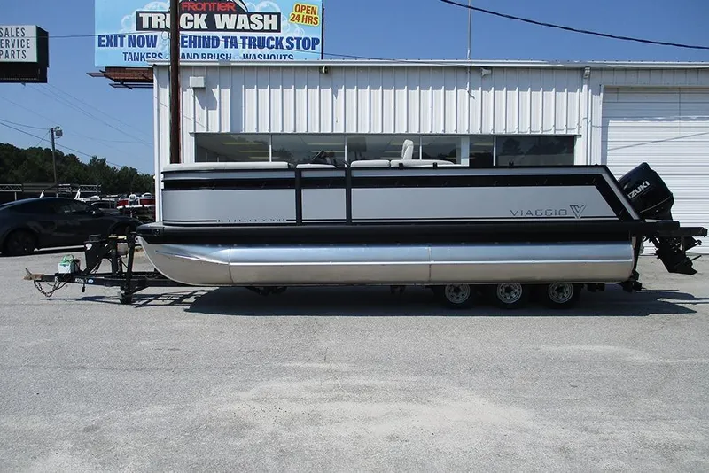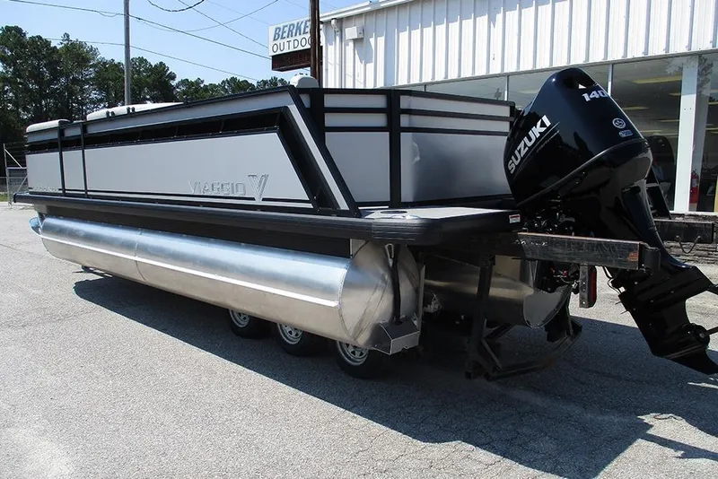 This Black and Silver Viaggio X20R Tritoon has a SUZUKI DF140 BTX5 outboard motor.