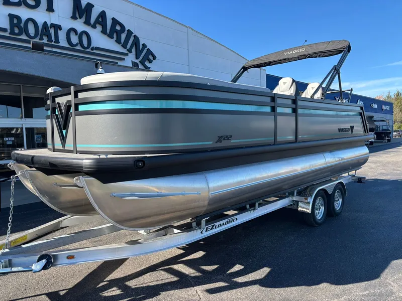 , Step into performance and luxury with the 2026 Viaggio X22Q, powered by a Suzuki 200 SS engine and backed by a standard 5-year warranty for total peace of mind. This high-performance tritoon delivers smooth, confident handling and impressive acceleration, making every outing on the water thrilling and effortless. The X22Q features a spacious, well-designed deck, plush seating, and ample storage, perfect for entertaining family and friends or enjoying watersports. Engineered for stability, versatility, and style, this model combines premium finishes with thoughtful details to maximize comfort and convenience. Whether cruising, tubing, or relaxing on the lake, the 2026 Viaggio X22Q offers a perfect blend of power, reliability, and luxury, making every trip an unforgettable boating experience.