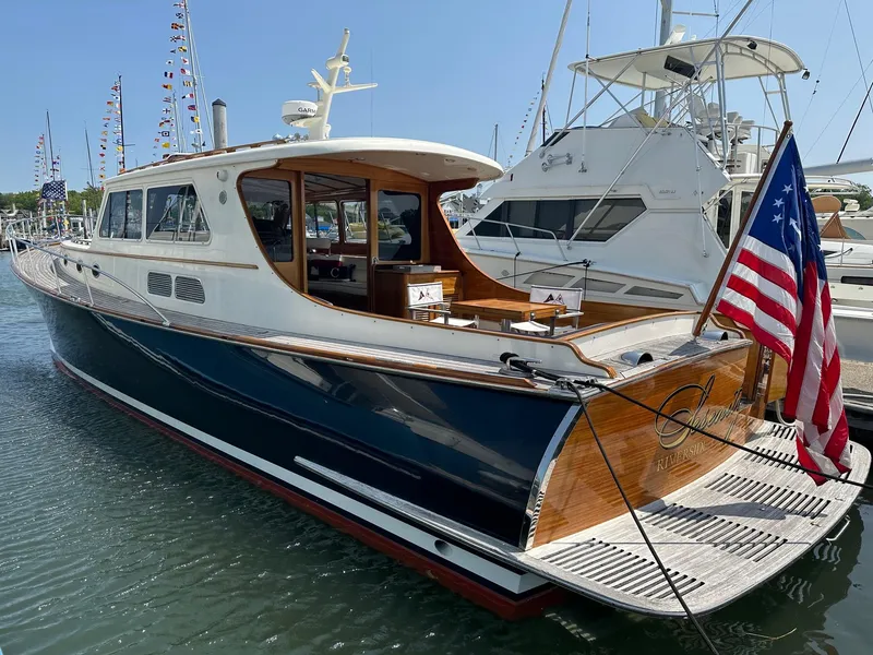 As you approach SERENITY you can't help but notice her graceful lines and down east heritage. Step aboard her teak and stainless swim platform and enter the cockpit through the starboard side transom door.