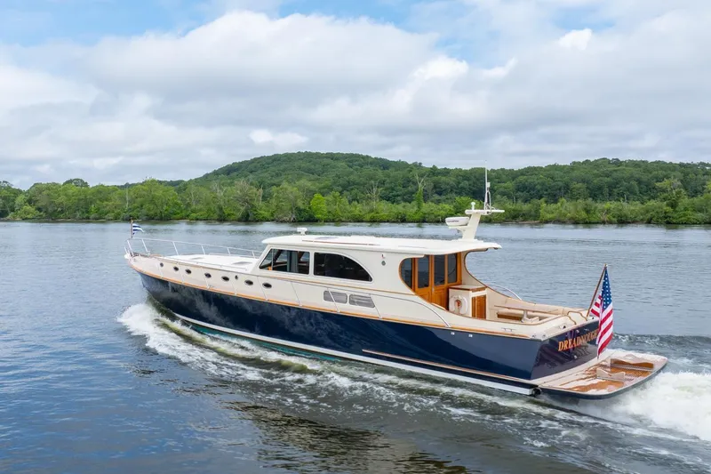 • DREADNOUGHT features recent Flag Blue Awlgrip hull paint as well as recent Cream colored Awlgrip paint on the pilothouse/ cabin top. Cream Awlgrip Double Boot Stripe, and a blue bottom