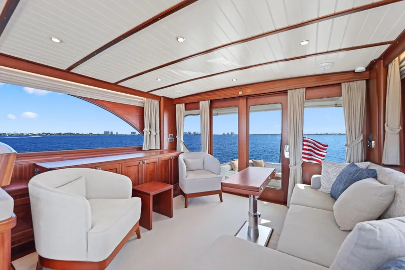 The expansive salon serves as the yacht's centerpiece, offering panoramic views and seamless indoor/outdoor living through double salon doors and a large sunroof that floods the space with natural light. Advanced comfort systems include the Humphree Stabilization System for smooth cruising and comfortable anchoring in any conditions, twin 13.5KW Onan generators providing complete power independence, and a professionally installed watermaker maintaining the 200-gallon freshwater system during extended voyages.