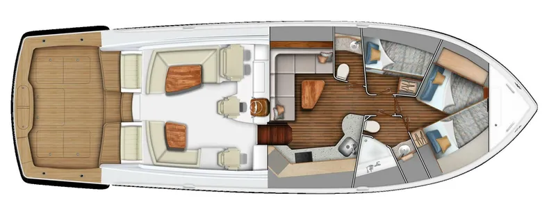 Below deck, Viking’s commitment to design and craftsmanship is evident in every detail. The two-stateroom layout includes a forward master with queen or crossover berths and ensuite head, and a guest cabin with upper and lower bunks. The starboard-side L-shaped galley is fully equipped with premium appliances – Sub-Zero fridge/freezer, microwave and cooktop – while a sleek HD TV above faces the port-side dinette. Outboard of the dinette is either a Pullman bunk or rod storage. A day head or rod/tackle locker forward of the dinette adds flexibility. As with all Vikings, the interior showcases premium craftsmanship. These models feature horizontal-grain walnut – with superior in-house joinery – for a fresh, elegant look.