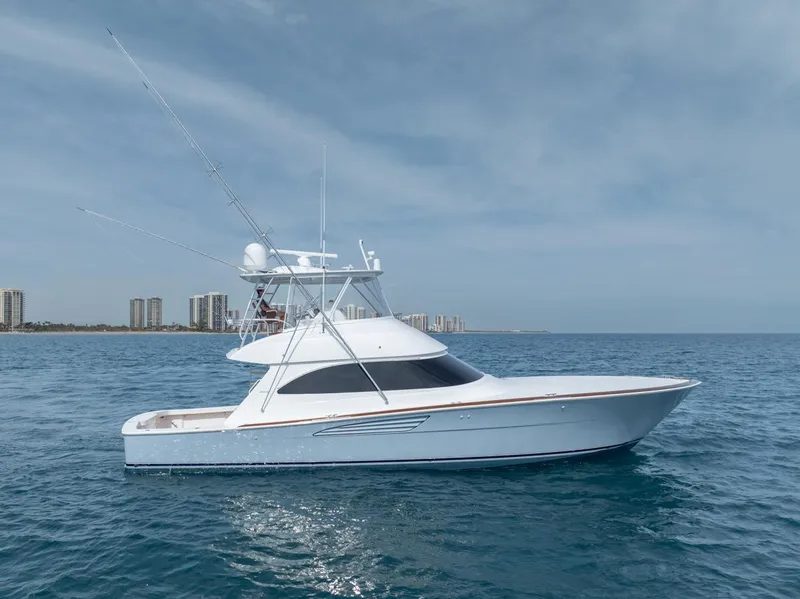 The Viking 54 Convertible delivers the perfect blend of sportfishing performance and luxurious comfort. This exceptional vessel features a Pamlico Blue gelcoat hull, a Viking hardtop, and a teak cockpit with faux teak toe rails, offering both durability and elegance. Powered by twin MAN 1550CRM engines and equipped with a Seakeeper SK18 for superior stability, this yacht is built to perform in any offshore conditions.