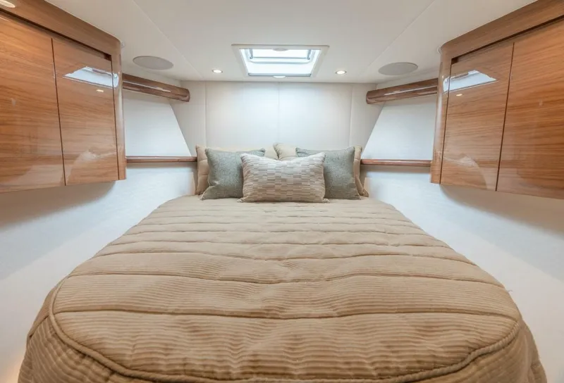The three-stateroom two-head layout includes a master suite to port with a walk-around queen berth sided by nightstands and a credenza to port. There is a large maple-lined storage area beneath the mattress, accessed via a gas piston-assisted lift-up top, and two drawers are integrated into the foot of the bed. A 32-inch HD TV is mounted above a second credenza. A generously proportioned maple-lined hanging locker accommodates a sizeable wardrobe.
