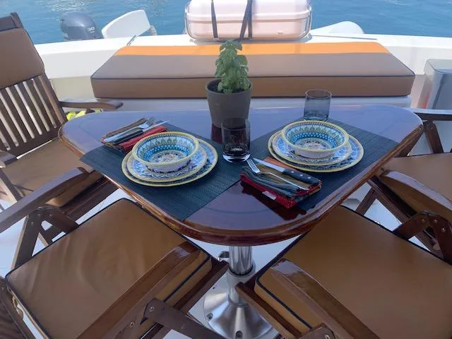 New Garmin Fantom 256, Two Garmin 8624's, New trolling valves(not installed), New Glendenning controls(throttles were switched from push pull to all electronic, New Palm Beach levers with bow thruster controls, New Dockmate wireless remote control, New Fusion and New speakers, New Denon dual zone surround sound receiver, New TV's, New Frigibar(never used), New Cockpit table and chairs, New six person liferaft, New Canvas, New upholstery, New vinyl flooring in salon, New carpet in staterooms, New batteries/cables, NewViking convection oven and more.