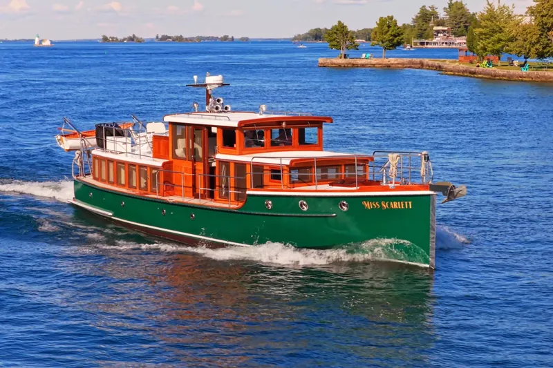 MAJOR PRICE REDUCTION OF $100,000. NEW PRICE IS $795,000. OWNER WANTS HER SOLD. Miss Scarlett is a fantastic classic and Grande Dame of the 1000 Islands. This Retro Modern Yacht meets current ACBY standards with over $2 million invested. At first, her size is deceiving. Inside the custom boathouse that the owner had built just for the 52-footer, you cannot judge her overall size. With a relatively low profile, the pilothouse motor yacht is pleasing to the eye. By today's standards, her 12-foot beam is narrow. Yet, for Miss Scarlett her lean beam is perfect.