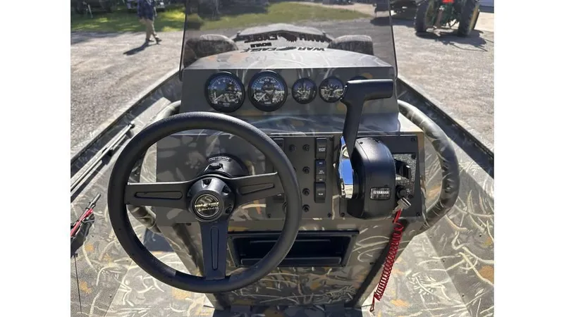 Standard equipment for the side console 961 Blackhawk includes a full skin out with carpet, vinyl or spray liner, 16 gallon fuel tank, 9" windshield, running lights with rocker switches, bilge pump, side console with live well, bracket with wiring for 24V trolling motor, storage box with driver and passenger seats, 2 seats with spiders, 2 pole extensions, bow storage, metal gas tank cover, 4 cleats, upgraded paint option, 3 base plates in front low deck, 1 base plate in high rear deck, V-bow and a V-hull.
