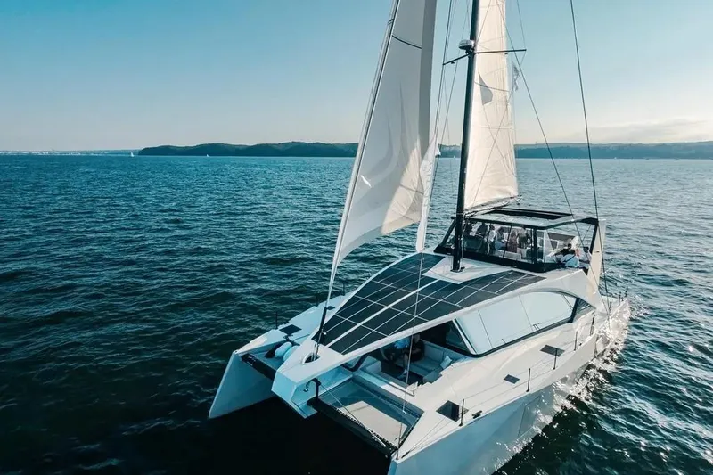 Twin 2024 Volvo Penta D3-110 diesels (low hours), sail drives, 8-10 kn cruise, 1200 nm range. Composite hull, 31 ft beam, 4'11" draft. Solar panels, energy generator, watermaker, full AC.