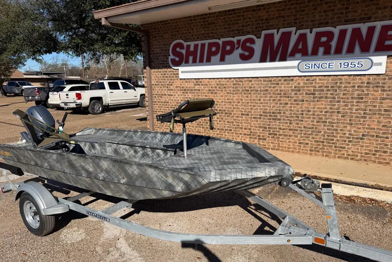 This 1448 modified-V camouflage jon boat offers a big boat layout with a casting deck, storage and a livebox. Split seating design at the stern and powered by the Yamaha F25.