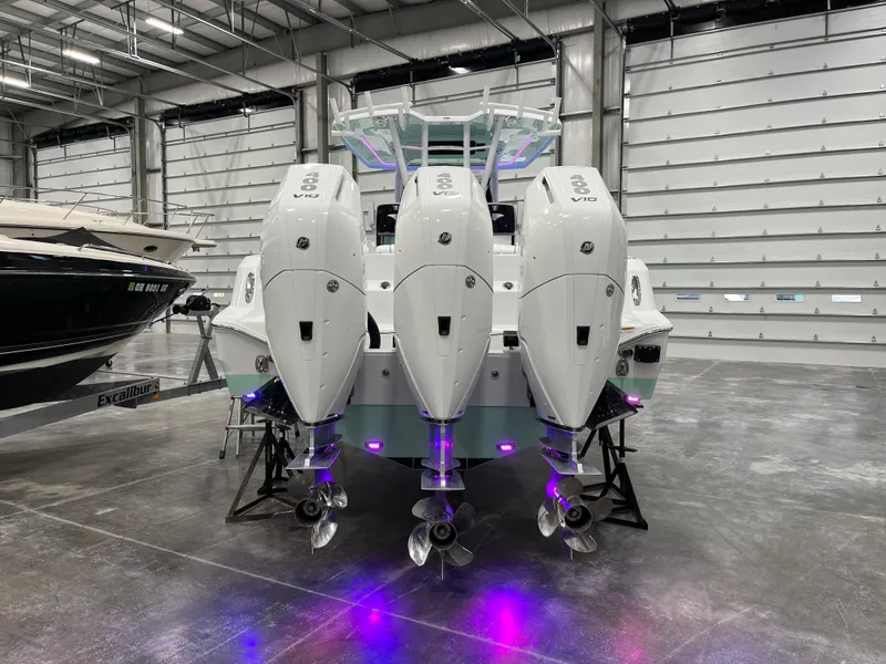 This 2026 Wellcraft 352 Fisherman offers great spaces for hardcore fisherman and family entertaining. When you board through the dive door on the port side, you will be greeted by the large aft fishing deck with foldaway bench seating. Under that bench seating, you have easy access to the bilge, allowing for ease of maintenance. Aft of that, you find a large livewell and sink. Continuing back to the built in swim platform, you have nonskid running all the way down to the transom for safety. That nonskid runs right into your upgraded Triple 400 Mercury V-10 Verado's, which push this boat up to 64 mph. Back up past the dive door, you run into a very spacious prep/entertaining counter. This houses an eye catching corner aquarium style livewell to the port and an easily accessible storage below. Above the counter, you have a built-in ladder for simple access to the large T-Top. Under that T-Top, you will find a State-of-the-Art electronics and features. These features include the well placed joystick to port just below the Dual 22" Garmin Touchscreens, all metal toggle switches and the electric assisted power steering and the Mercury Shifters. You will also find Mercury vessel view above and the Seakeeper 3 display to starboard. All of these features while having the comfort of 3 side by side helm chairs with arm rests and leaning bolsters and the center captains seat folding down for extra standing room. Ahead of this to port, you will find a door down to a small cabin which houses a head and sink, Seakeeper 3, electrical panel w/ battery switches and small bed. Ahead of the stylish console you find a large lounge seat with arm rests. Below you will find a insulated fishbox. The bow also accommodates the bow seating package with with more storage below and the optional table/sunbed and cooler. The windlass can be found at the very front by opening the front hatch.