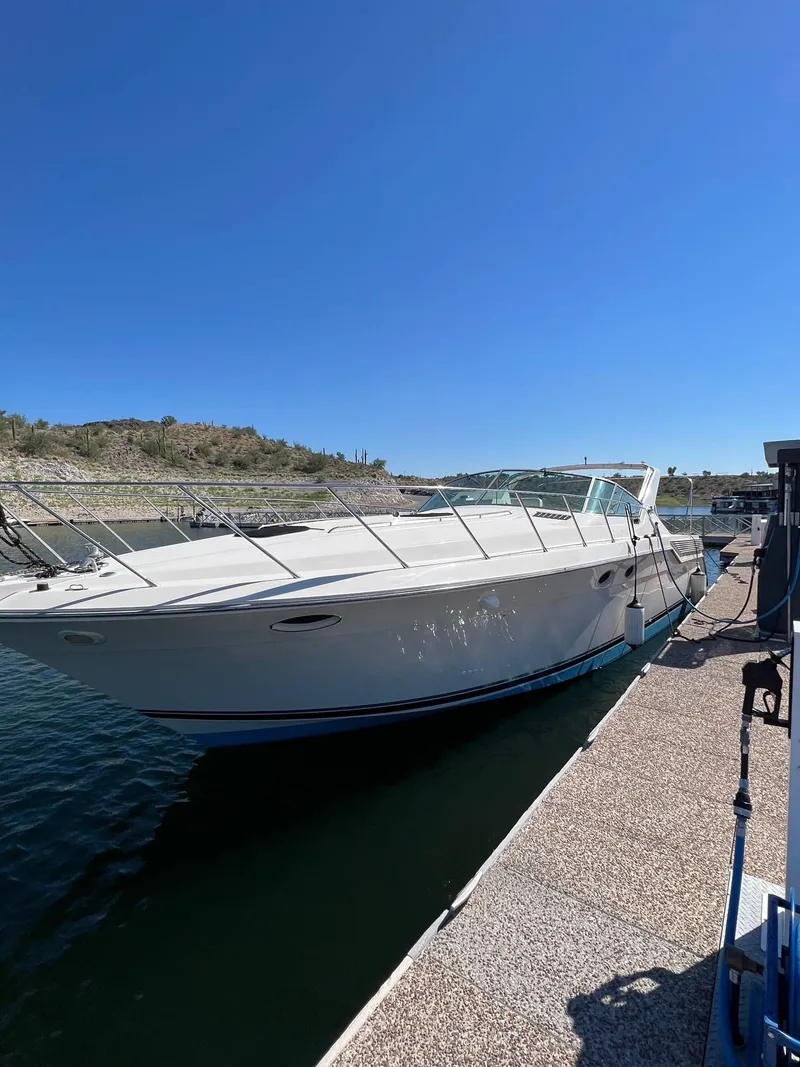 1991 Wellcraft Portofino, **Overview:** Experience luxury and performance with this immaculate 1991 Wellcraft Portofino. At 43 feet in length, this boat is designed for those who value both comfort and adventure on the water. With its extensive list of features, upgrades, and a carefully maintained condition, this boat is turn-key and ready for its next owner. **Specifications:** - **Year:** 1991 - **Make:** Wellcraft - **Model:** Portofino - **Length:** 43' - **Engines:** Twin 502 ci 365 HP Mercury Inboards - **Generator:** 8KW Westerbeke - **Sleeping Capacity:** Sleeps 6 comfortably **Features & Upgrades:** - **Air Conditioning:** Triple marine A/C units to keep you cool in the warmest weather. - **Sleeping Quarters:** Spacious and comfortably sleeps six. - **Head:** Large head with full-size shower and ample freshwater storage. - **Galley:** Full galley equipped with microwave, refrigerator, stove, and two new flat screen TVs. - **Interior:** Brand new Berber marine-grade carpet for a stylish and durable finish. - **Exterior:** All new extended Bimini top and a full cockpit cover, ensuring protection and longevity. - **Maintenance:** New bottom paint, engine tune-ups, and full service completed ensuring it's in peak condition. - **Batteries:** Equipped with all new top-quality Odyssey batteries. **Condition:** This Wellcraft Portofino has been meticulously maintained and has undergone a full service. It is in excellent condition with no known issues or maintenance needs, assuring peace of mind for the next owner. This boat is truly turn-key - all it needs is a new owner to take the helm and enjoy! For more information, additional photos, or to schedule a viewing, please contact us. This Wellcraft Portofino won't last long at this price - act fast and make it yours today! Century Marine carries an outstanding selection of New and preowned boats including; Centurion, Regal, Supreme, Veranda, Sea Ray, Chaparral, Rinker, Malibu, Maxum, Sleekcraft, Cobalt, Mastercraft and Carver. We carry pontoon boats, cruisers, wakeboard boats, ski boats, jet skis, houseboats and sailboats. Let our years of experience help if you on your next boat purchase. If you have questions on the sales programs or financing options, please give us a call. We would love to meet with you and see how we can assist you in your boating or RV needs. Century Marine at Lake Pleasant Harbor is located 35 miles northwest of downtown Phoenix, on the southeastern shores of Lake Pleasant.