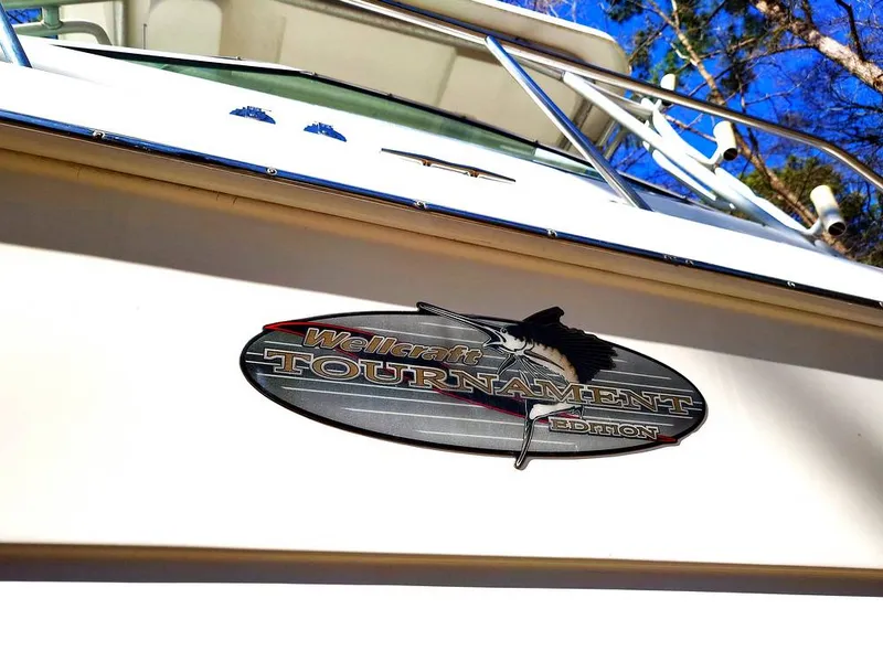 The large Wellcraft has bottom paint that is in used condition, the outdrive has some electrolysis, The dual steel prop is in good condition, the decking and fish boxes good condition for a saltwater fishing boat, the helm seating- is good, the interior cabin is in outstanding condition with a clean header, no mold, no dampness, the head is excellent. The transom has a constructed exterior piece that has cracked and broken. photo demonstrates.