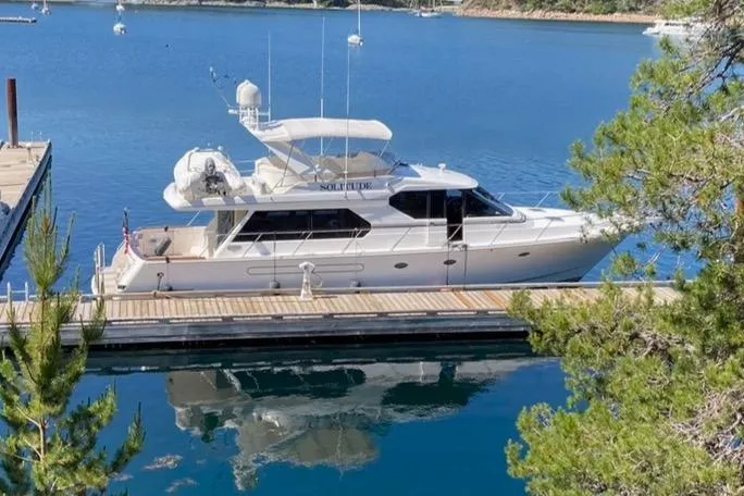 SOLITUDE's well suited design and layout make her extremely practical for either a cruising couple or the entire family to operate with ease. The pilothouse design offers superb visibility from both the inside helm deck and on the fly bridge helm. In addition she has a cockpit docking station to assist with stern ties and or quick access to engine controls while fishing.